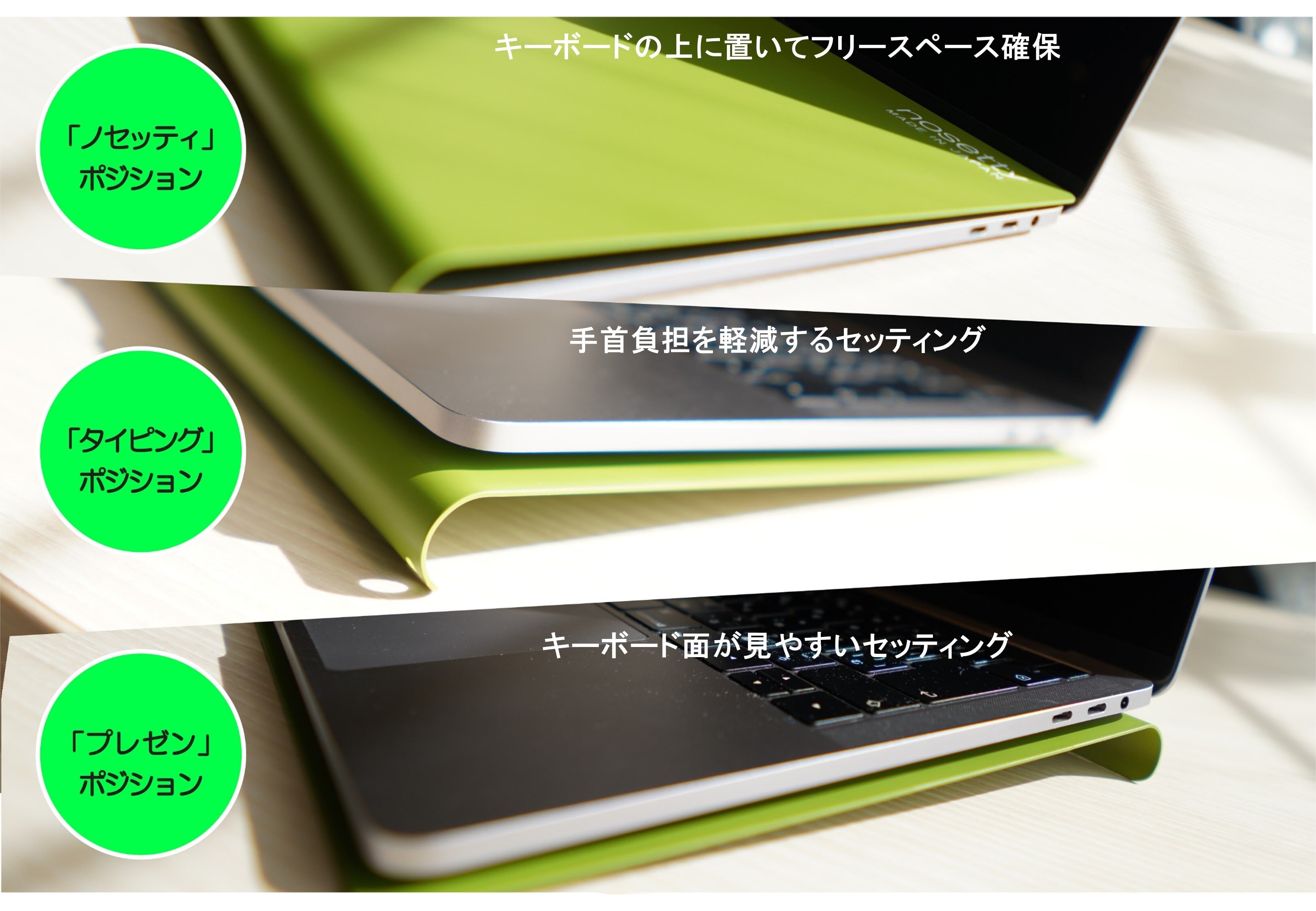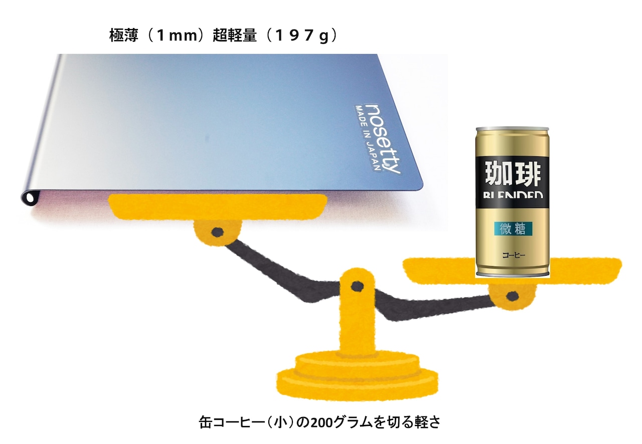 「nosetty=ノセッティ」は、ノートPCのキーボード上に、キーをプロテクトしながらちょっとした小物や資料を置くスペースをつくるトレーです。PC本体の下に敷けばアルミ材ならではの放熱効果が得られ、更に傾斜を2通り変えられるので、タイピングやプレゼンテーションを快適にします。