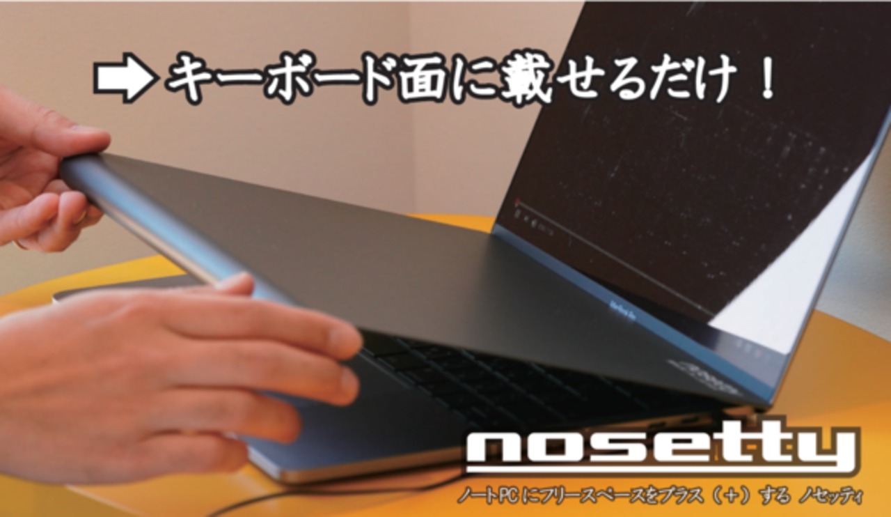 「nosetty=ノセッティ」は、ノートPCのキーボード上に、キーをプロテクトしながらちょっとした小物や資料を置くスペースをつくるトレーです。PC本体の下に敷けばアルミ材ならではの放熱効果が得られ、更に傾斜を2通り変えられるので、タイピングやプレゼンテーションを快適にします。
